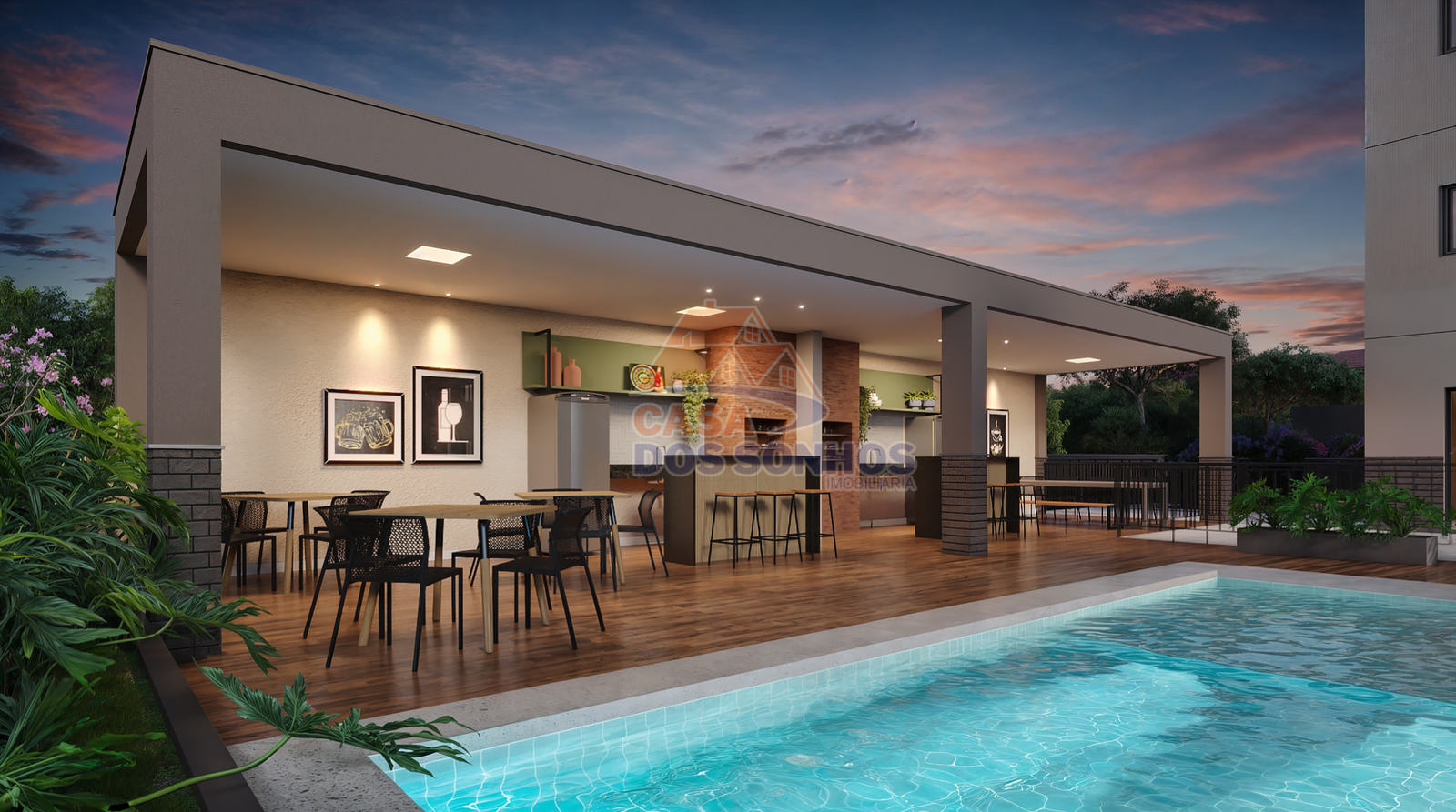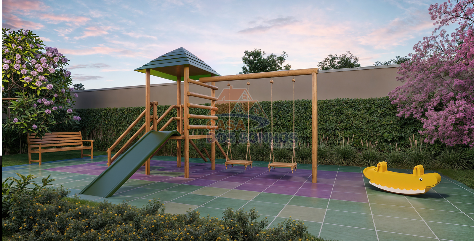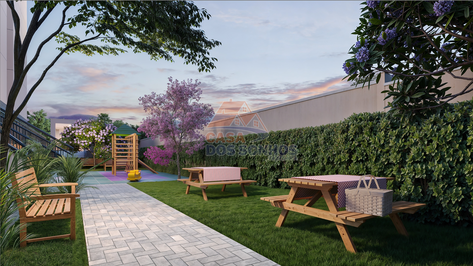 Diversão: Minicampo gramado, Deck com churrasqueira, Espaço Kids e Brinquedoteca.